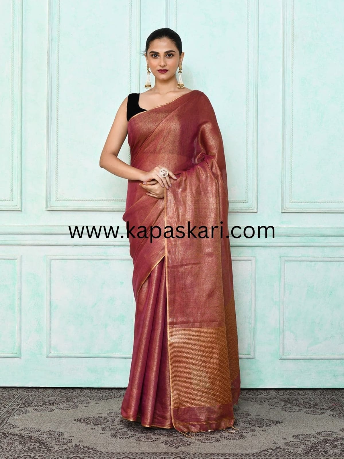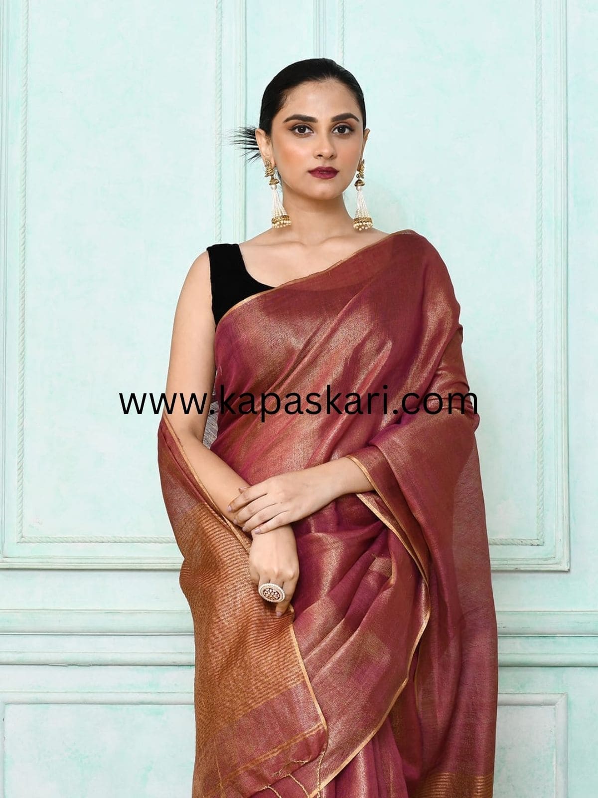 Home Saree Linen Handloom Metallic Zari Linen Saree .